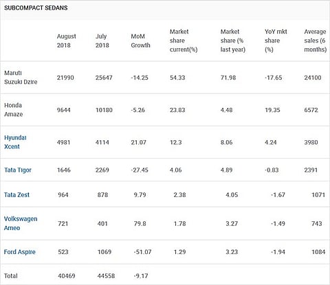 Sales figures for the subcompact sedan segment are out for the month of August 2018. And as expected, the Maruti Suzuki Dzire and the Honda Amaze continue to the lead the segment, which comprises of 7 models as of yet. Here’s how each car in this category fared on the sales chart in August: