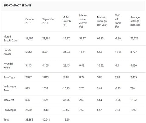 1. All models except the Tigor and the Aspire saw negative growth in October despite the festive season. The Honda Amaze took a big hit selling 2859 units less than in September, while the Maruti Dzire sold 3892 units less in the same period. However, in terms of month-on-month analysis, the Amaze equals to -34.03 per cent as compared to Dzire’s -18.27 per cent. The entire segment saw a negative month-on-month growth of -16.69 per cent.