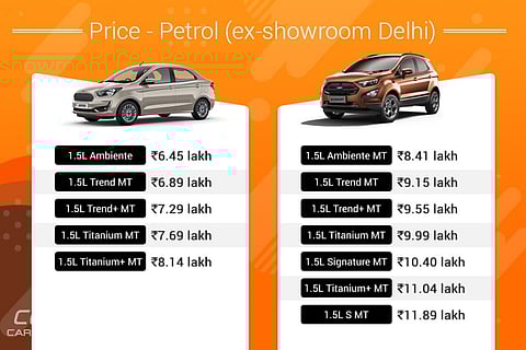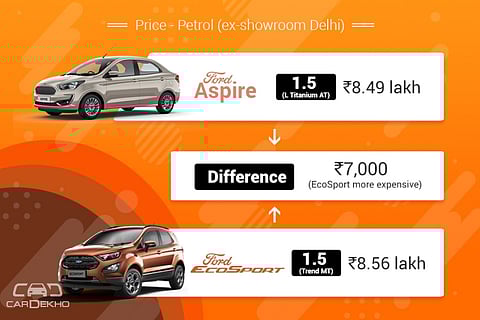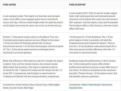 Priced from Rs 5.55 lakh to Rs 8.49 lakh (ex-showroom), the 2018 Ford Aspire gets a facelift and some updates to take on its subcompact sedan rivals like the Honda Amaze, Maruti Suzuki Dzire and Hyundai Xcent. It’s bigger sibling, the Ecosport is a subcompact SUV which is priced from Rs 7.82 lakh to Rs 11.89 lakh (ex-showroom). Yes, the two cars are very different, but since their prices intersect at some level, we’ve pitted them against each other to see how few or how many comparisons can be made.