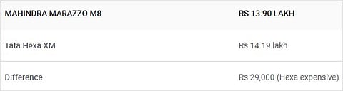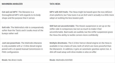 The introductory prices of the Mahindra Marazzo start from Rs 10 lakh and go all the way up to Rs 13.9 lakh (ex-showroom India) for the top variant. In this price range, one can also opt for a few overlapping variants of the Tata Hexa. But if you are in the market for a 7-seater, which one of the two should you pick? We answer which one offers the best value for your money. But first, let’s get done with the major differences between the two.