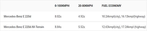 Estates or station wagons are known more for their practicality than outright performance. If you’re looking for a fast luxury car priced between Rs 55 lakh to Rs 75 lakh but want a three-pointed star on the nose, Mercedes-Benz offers its most popular model in two different iterations - the E 220 d long wheelbase sedan and the All-Terrain 220 d rugged station wagon. To find out which of the two offers better real world performance, we compare their specifications, acceleration, braking and the all-important fuel efficiency.