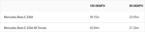 When it comes to dropping the anchor, the E 220 d All Terrain lags behind its sedan sibling once again. This could be due to its higher weight of 2570kg. In comparison, the sedan weighs 1810kg. As a result, it stops around 3.5m to 4m later than the sedan.