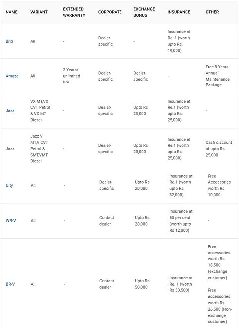 Honda is giving various kinds of offers across all cars in its lineup save for the Accord Hybrid and the recently launched CR-V. Benefits range from free extended warranty, free insurance (only through Honda Assurance), accessories to exchange bonuses. Honda is also offering corporate discounts with its cars, but they vary from region to region. Buyers will have to contact their nearest dealers to know about them.