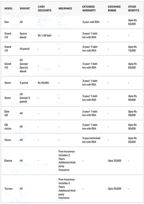 - The Verna, Elite i20 and i20 Active are available with benefits of upto Rs 50,000 and a 3-year warranty with RSA