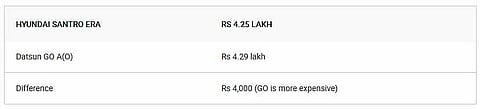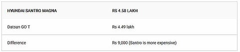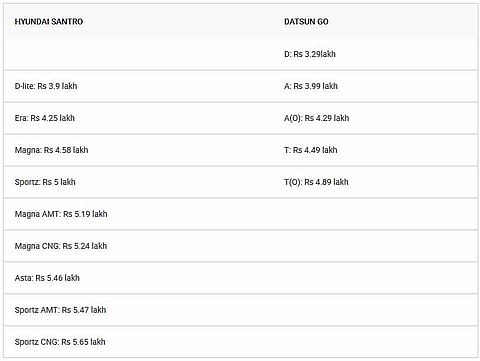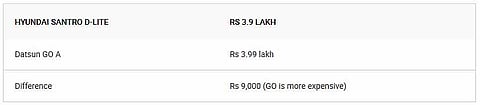 In October itself, there have been two product launches in the budget hatchback space - one is a facelift and the other is a brand-new model with an old-familiar name. Buyers now have two new options to consider - the Hyundai Santro with prices starting from Rs 3.9 lakh, or the Datsun GO that was launched earlier with a starting price at Rs 3.29 lakh (all prices ex-showroom, Delhi). Both compact hatchbacks appear to be promising products with plenty of features as standard with Hyundai offering a couple of segment firsts as well. Until we can carry out full-fledged comparison, we dive into the details on paper to see which one offers better value for money.