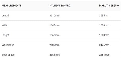The Santro and the Celerio are the same height and offer the same amount of boot space but the Hyundai hatch is wider. However, the Maruti hatch is longer and thus also has a longer wheelbase.