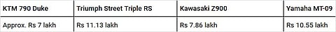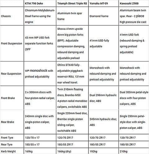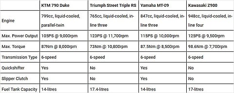 There was a point in time where the mid-displacement supersport segment garnered the most attention from enthusiasts. It played a pivotal role by bridging the gap between beginner bikes and litre-class rockets. That was then. Fast forward to the present day and preferences have changed. Today, motorcycle enthusiasts would rather have a mid-displacement naked that offers similar handling dynamics as their faired siblings. That’s not to say that power has taken a backseat. These super-nakeds have plenty of punch to leave you grinning for days, while new-age electronic rider aids make sure you stay within your limits. In India, we have been serenaded by the Triumph Street Triple RS, wooed by the Kawasaki Z900 and had our senses knocked right out of the park by the Yamaha MT-09. However, we hope that the soon-to-be-launched KTM 790 Duke will be able to do all of the above while being more affordable than the others. Here’s how the newest kid on the block stacks up against its established rivals.