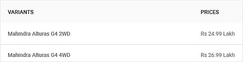 The 2WD version of the Mahindra Alturas G4 will be loaded with features like HID (high intensity discharge) headlamps with LED cornering and fog lamps, an 8-way adjustable driver seat with power lumbar support, leather seats, dual zone climate control, cruise control, tyre pressure monitoring system, and an 8-inch touchscreen infotainment system with Apple CarPlay and Android Auto.