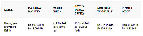 Mahindra Marazzo’s prices range in between the range of Rs 10 lakh to Rs 13.90 lakh. With this, it doesn’t have any direct rival but a few established rivals at both ends of the spectrum. Rivalling its lower variants is the Maruti Suzuki Ertiga, Renault Lodgy while the higher variants undercut the Toyota Innova Crysta. We put them in an on-paper comparison with the Mahindra Marazzo.