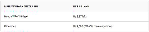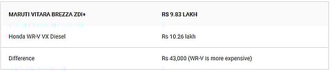 The Honda WR-V is currently priced between Rs 7.79 lakh and Rs 10.26 lakh. The Maruti Vitara Brezza, which is the segment leader as far as sales are concerned, starts from Rs 7.58 lakh and goes up to Rs 10.33 lakh (all prices are ex-showroom*, Delhi). While we did compare the cars back to back a year ago, this time let’s see how their corresponding variants fare against each other.