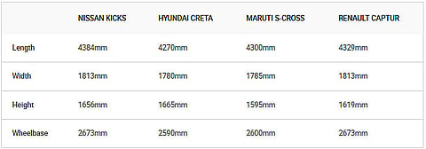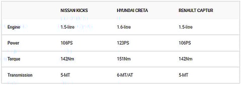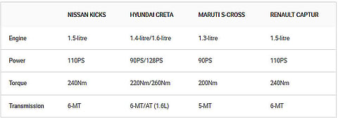 Nissan recently revealed some of the details of its upcoming compact SUV, the Kicks, which is set for a January 2019 launch. When launched, the Nissan Kicks will rival the Renault Captur, Hyundai Creta, Maruti Suzuki S-Cross and the upcoming Kia SP2i (codenamed). While more details of the Kia SUV are expected to be revealed closer to the launch, here’s a spec comparison of the Kicks with other compact SUVs that are on sale in India.