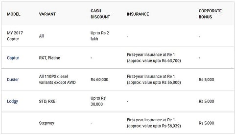 The Duster and Lodgy receive a discount of 60,000 and Rs 30,000, respectively. These two cars along with the MY-2018 Captur are available with additional offers, including first-year insurance at Re 1 that can save upto Rs 63,700 (depending on the variant and model) and a corporate bonus of Rs 5,000.