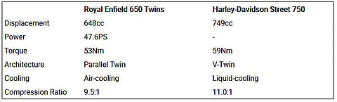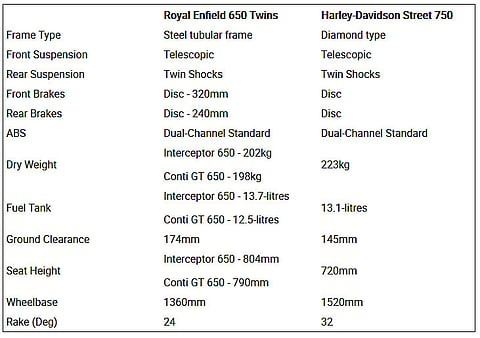 We’ve been waiting for over a year to see the Royal Enfield 650 Twins, the Interceptor 650 and Continental GT 650 on Indian roads. Fortunately, with the international launch behind us, that shouldn't be so far behind. Once launched, it would be interesting to see how the RE Twins perform against the current segment heavy-weight, Harley-Davidson Street 750 on our roads. But until then, let’s just compare them on paper and see how the two fare on the specs front.