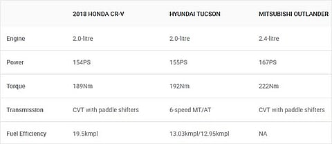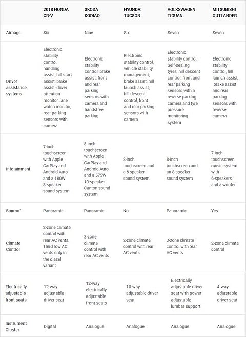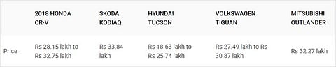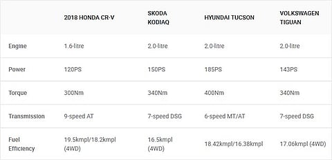 Honda has just launched the fifth-gen CR-V in India with a price tag between Rs 28.15 lakh and 32.75 lakh (ex-showroom pan-India). At this price point, the CR-V takes on the likes of the Skoda Kodiaq, Hyundai Tucson, Volkswagen Tiguan and the Mitsubishi Outlander. So, let’s take a look at how the new CR-V fares against its rivals on paper.