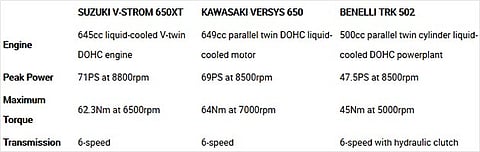 Up until the Suzuki V-Strom 650 came along, the Kawasaki Versys 650 was the only 650cc adventure tourer available in India. Soon, Benelli too will join the party with its TRK 502. The Italian motorcycle manufacturer has already confirmed that it will launch the adventure tourer by the end of 2019. And while all three adventure tourers seem promising, it’s quite difficult to pick the best of the lot. Hence, we’ve compared their spec sheets to see which one comes out on top.