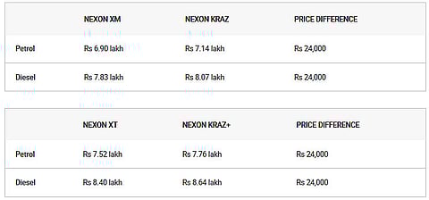 To commemorate the first anniversary of the Nexon, Tata has launched a special edition model of the sub-4m SUV. Dubbed the Nexon KRAZ (pronounced as “craze”), it is available in two variants: KRAZ and KRAZ+. The Nexon KRAZ is priced at Rs 7.14 lakh and Rs 8.07 lakh with petrol and diesel engines, respectively. The Nexon KRAZ+, on the other hand, is available at Rs 7.76 lakh and Rs 8.64 lakh for petrol and diesel, respectively.