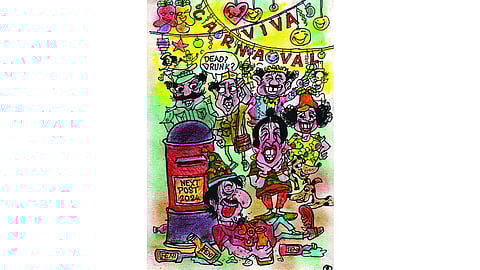 Limertoon’, the portmanteau of limerick (a five-line poem with rhyme scheme AABBA) and cartoon, was coined by the man who loves wordplay; his verse above elaborates this reasoning. Even his own pseudonym, Alexyz, was inspired by Anthony Quinn’s ebullient character Alexis Zorba in Zorba the Greek (1964), as an attempt to outshine competition with a common Christian name, Alex Fernandes. The Mumbai born-bred St Xavier’s College alumnus gave up on his football dreams after an injury, joined and quit advertising within a year because “I couldn’t keep telling lies”, moved to Siolim to start an NGO with friends, before switching to cartooning fulltime.