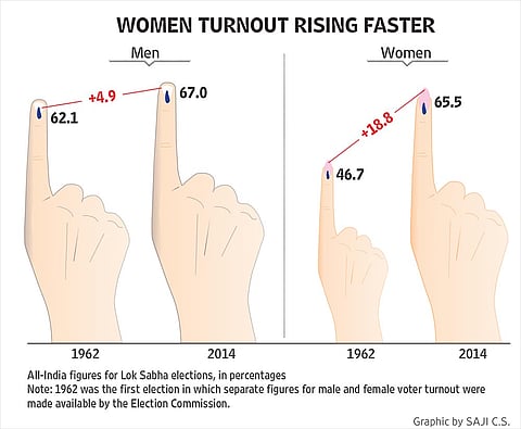 Perhaps the most heartening sight while travelling around the country during elections is long queues of women outside polling booths, waiting to vote. These lines are often longer than the separate queues for men. The current high level of women’s participation has been a major development in India’s democracy. In 1962, the turnout of women was only 47 per cent (of the total female electorate), yet by 2014, it had shot up to 66 per cent—up by nearly 19 percentage points. On the other hand, men’s turnout grew by only 5 per cent over the same period.