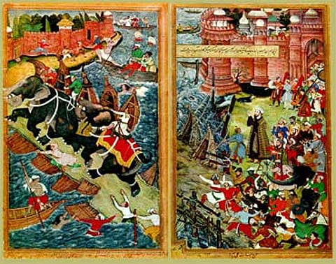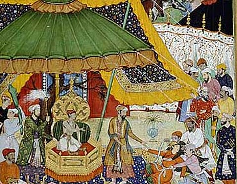 But though the film creates a fantastically perfect flesh and blood Jodha, it takes away from the power of her limitless beauty by placing her in opposition with not the other beauties of the harem who would naturally hate her for winning Akbar’s favour, but against the plain, old and scheming, Maham Anaga (Akbar’s wet nurse). The only other significant female character in the movie is the utterly unconvincing, verging on the ridiculous, persona of Hameeda Bano, Akbar’s Persian mother. One would have expected an astute director as Ashutosh Gowarikar to take full cinematic advantage of the delightful mysteries of the inner palace of the Mughals and weave the musical magic of Tansen’s singing to create a riveting romance like the one K. Asif conjured in Mughal-e Azam. While Rushdie cashes in on the Akbar-Birbal anecdotes, Gowarikar’s film skirts the “Nine Gems” altogether, even in scenes of the royal courts which could have benefited from some serious research on how to depict Mughal court culture.