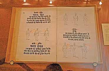 The manuscripts range from humble texts to spectacularly illustrated ones. In format, they range from horizontal pothis to tiny scrolls. They also reveal the evolution and spread of our knowledge systems. "There are works from every sphere—cosmology to cosmetology," says Gopalakrishnan. There are ancient texts on architecture, music, philosophy, medicine, even dream interpretation and veterinary science, like the Gajayurveda, the study of elephants, illustrated in the Mewar miniature style. Padatishiksha is a 19th century infantry manual of Raja Ranbir Singh.