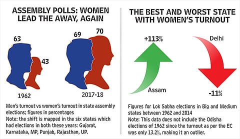 In 1962, the turnout of women was only 47 per cent (of the total female electorate), yet by 2014, it had shot up to 66 per cent—up by nearly 19 percentage points. On the other hand, men’s turnout grew by only 5 per cent over the same period.