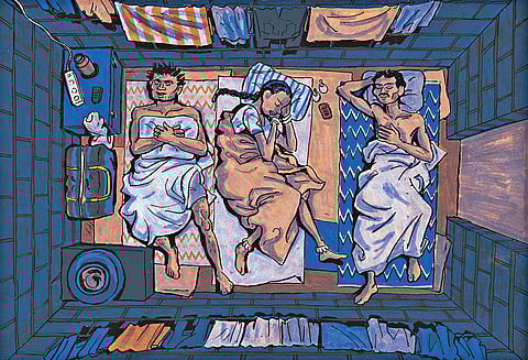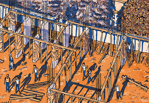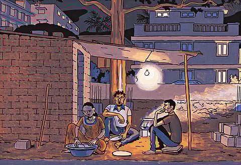 “Bloody noisemakers!” Rafik and his brother Mehboob—characters from Simon Lamouret’s graphic novel The Alcazar—would often get cussed at by their neighbours at the construction site where they lived. The last time they played a cricket match, an elderly man had threatened to call the cops, forbidding them to play next to his house. But caught between a life of cement and bricks, the brothers stay on in the hope of being treated better at the cost of extra labour.