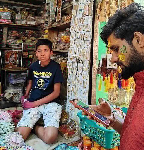 Reflection of unwavering faith as a man with 'Shree Radhe' tattooed on his cheeks, purchases a Radha locket at a shop near Radha Rani Mandir at Barsana.