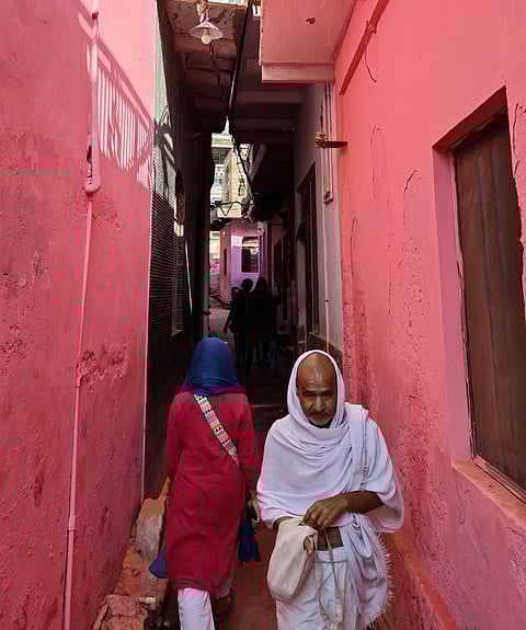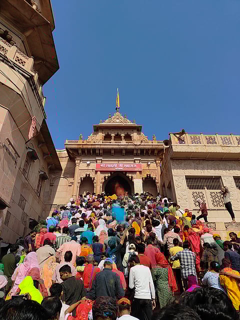 Journeying through the winding paths, each step whispers tales of devotion and tradition. Pilgrims pass the colorful narrow alleys to Radha Rani Mandir in Barsana, Uttar Pradesh.