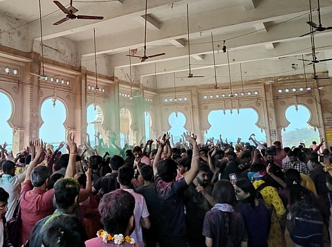 Lost in devotion and joy, devotees dance to the beats of 'Apni Thakrani Shri Radhika Rani' at Barsana's Radha Rani Temple.