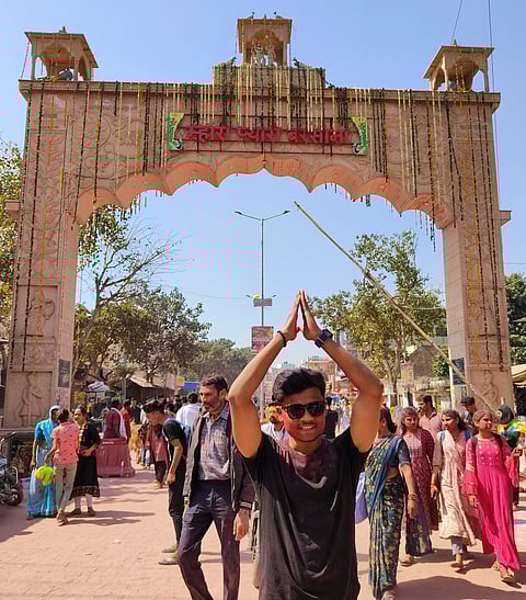 A boy with folded hands poses as his love for Radha shining bright at the entrance of Barsana's Radha Rani Temple in Uttar Pradesh. The entrance door welcomes visitors with the inscription ‘mhara pyara Barsana’ on its wall.