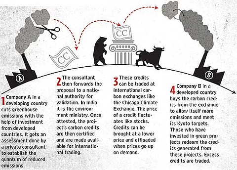 First World countries are expected to buy certified emission reduction (CER) aka carbon credits, or earn them by investing in green projects under the CDM process. CERs are a ‘certificate’, like a stock, and are used to trade emission credits. Emission reduction projects can range from growing bio-fuel crops to installing machinery at a chemical plant, from neutralising GHGs to building a hydel generator. India ranks second, after China, in developing CDM projects and generating carbon credits.