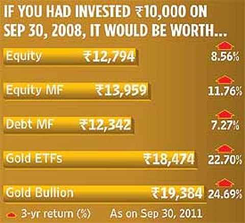 In another example, a group of 15 salaried friends in Mumbai has come together to collectively and systematically save funds on a monthly basis to invest in gold exchange-traded funds. Assets under management for gold ETFs have gone up 10 times over the last three years. “Demand for gold bullion and gold-related investments is a recent phenomenon and probably has a lot to do with the performance of other asset classes,” avers Devendra Nevgi of Delta Global Partners.