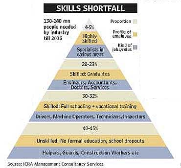 But with 300 million people expected to enter the job market in the next 19 years, that's clearly not enough. As things stand, "there is not only a mismatch in the quantity, but also the quality of training...it doesn't always match up with job market requirements. And this is at the middle level," points out Sukti Dasgupta, ILO senior specialist on employment and labour market policies. According to consultancy firm Manpower, engineers, IT staff, technicians, sales representatives and teachers are the top five categories where there is a major shortage of skilled manpower. "Around 58 per cent of youth seeking employment suffer from some sort of skill deprivation, impacting productivity. The agony and ecstasy of the Indian labour market is that companies can't find suitable employees and workers can't find remunerative work," says Manish Sabharwal, chairman of TeamLease Services, a major placement provider.