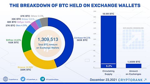 A recent data shared by CryptoRank Platform, data aggregation and analytics platform, shows that crypto exchanges hold 6.2 per cent of Bitcoin Circulating Supply or 1.3 million Bitcoin (BTC). Meanwhile, prices of mainstream and meme coins rise on December 24 at 6:00 pm IST, data of Coinmarketcap.com shows.