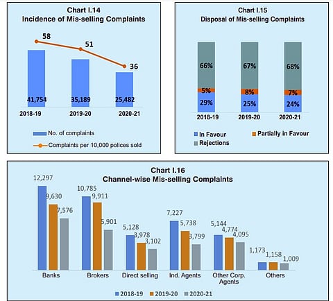 According to the Irdai annual report 2020-21, the number of mis-selling complaints have reduced from 41,754 in 2018-19 to 25,482 in 2020-21. Incidence of mis-selling complaints per 10,000 policies sold has also reduced over the years. The complaints being disposed in favour of the complainant has reduced from 25 per cent in 2019-20 to 24 per cent in 2020-21.