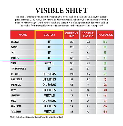 The growing prominence of intangibles is well reflected in the earnings multiple of companies where asset-light companies are fetching extremely high premiums to their long-term historical averages. On the other hand, companies with top-heavy asset models are trading at a massive discount to their historical averages (see table).