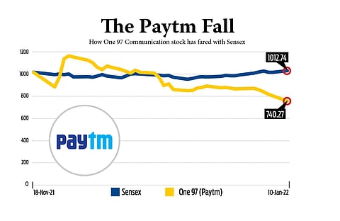 Paytm’s parent company One97 Communications Ltd has been on a downward spiral right from the day of its debut in the stock market. The stock fell over 27 per cent on its debut day on the bourses. Since November 18, 2021, the stock has fallen over 40 per cent as compared to broader market indices Sensex and Nifty, which are down 1.27 per cent and 1.34 per cent, respectively, as on January 10, 2022.