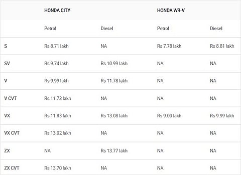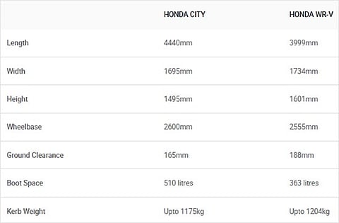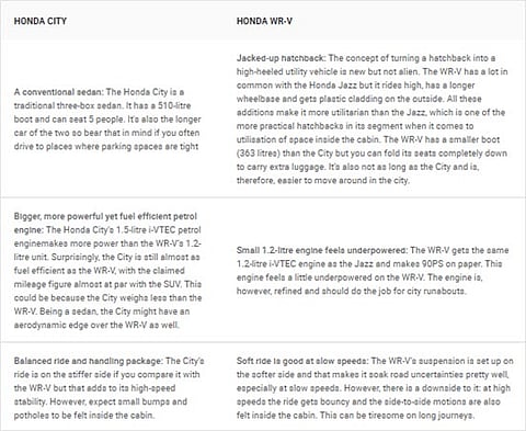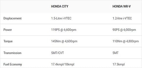 Everyone knows the Honda City and WR-V are not natural rivals. The former is a conventional three-box sedan while the latter is essentially a jacked-up hatchback with some cosmetic enhancements to make it look rugged. What’s common is that they are both Hondas and share their diesel engine, but there’s only one petrol variant of each of these cars that’s priced so close that some buyers might want to compare the two.