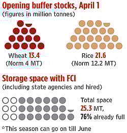 To make up for lack of private sector participation, the FCI is targeting buying in excess of last year’s procurement. Even after accounting for the normal monthly offtake of about 3.9 million tonnes for various government programmes, the buffer stocks will be far in excess of last year’s stock. The way forward, agronomist Ashok Gulati of ifpri feels, is to allow "the private traders to hold stocks and export when world markets are conducive". But the government, he feels, never takes a timely decision. "The decision to export should have been taken long back when global prices were favourable and all indications of a bumper crop were evident."