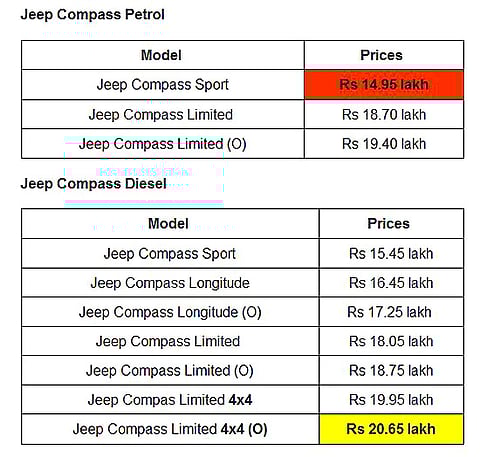 Jeep has surprised everyone with the Compass’ cut-throat pricing, which starts at Rs 14.95 lakh (ex-showroom, New Delhi). The Jeep Compass undercuts its immediate rival, the Hyundai Tucson by over Rs 3 lakh for the petrol trim and nearly by Rs 5 lakh for the diesel!