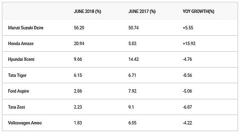 The overall sales of the sub-4m sedan segment saw a marginal MoM drop of 0.27 per cent in June 2018. There are seven different cars in the segment to choose from; however, three of these seven cars -- Maruti Dzire, Honda Amaze and Hyundai Xcent -- contribute nearly 87 per cent of the total segment sales. Here are the sales numbers.