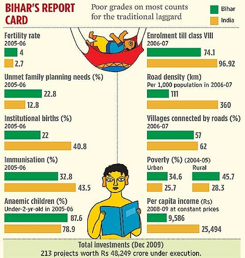 Whether it is external aid or the NREGS, Bihar still has to reap its dues. The shortcomings in large part remain that of the state, which does not fully utilise the funds available even for central government-funded programmes like the Integrated Child Development Services (ICDs). The vacancies in the ICDs programme are as high as 92 per cent. Similarly, while primary teachers have been employed in large numbers and school buildings have been improved, the teaching quality remains dismal in most of them.