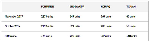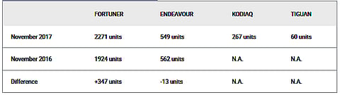 The premium SUV space is among one of the most popular segments in the country. Like before, it continued to overshadow its sedan counterpart in November as well. The Toyota Fortuner has been leading the segment by a wide margin for a while now and is followed by the equally competent Ford Endeavour. While the Fortuner and the Endeavour are body-on-frame offerings, this year we saw the introduction of two new monocoque SUVs in a similar price band from VW Group: the Skoda Kodiaq and the Volkswagen Tiguan.