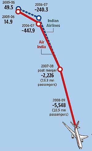 The merger to form National Aviation Company of India Ltd (nacil) was announced in August ’07, but AI sources aver that basic prerequisites were not followed. Among them: the integration concept was not discussed with employee associations though it involved merging “a vertical reporting line of AI with the regional reporting patterns of IA” which has led to duplication of officers in many posts. Then, revenue and reservation systems were not integrated leading to a duplication of airport counters and ticketing systems; a comprehensive vrs was not enforced causing gross over-staffing (staff strength is thrice that required). All put together, the ill-conceived merger drained AI—it’s bleeding a whopping Rs 300 crore a month.