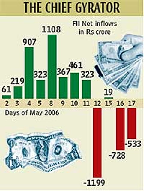 Mercifully, it was a Saturday and the markets were closed. But on Monday (May 15), a typical herd mentality gripped the traders and the speculators. "The most important cue for retail investors is to see what the FIIs are doing. When they saw that the FIIs had got out of the market so quickly, there was panic," says one investor. Adds a bemused sub-broker: "When a large FII sells, others see it happening and doubt their own long position. They sell too. This results in a domino effect. The result was evident on Monday."