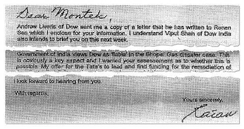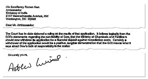 It's now clear why Dow is not keen to get entangled in the Bhopal tragedy case. On November 8, 2006, Liveris shot off a letter to Ronen Sen saying "it was a pleasure to see you again at the US-India CEO Forum in New York on 25 October. I especially appreciated your support in discussing resolution of the Bhopal legacy issue as a tangible, deliverable outcome for the CEO Forum." The letter added that since the Indian government representatives admitted at the meeting that "Dow is not responsible for Bhopal and will not be pursued by the GoI, it will be important to follow through to ensure that concrete, sustained actions are taken that are consistent with these statements".