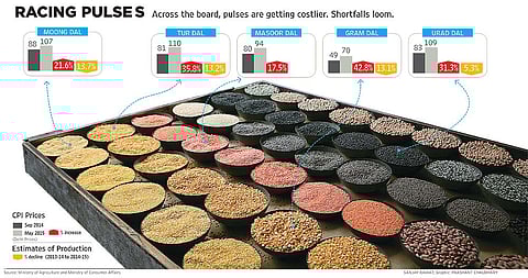 Alarmed, the central government has urged the states to inform it about the shortfall in supplies, so that imports may be stepped up to curb rising prices. So far, however, the states have not been very forthcoming in either furnishing the information or moving ahead with imports, says Union agriculture minister Radha Mohan Singh. “As pulses (like oilseeds) are grown mainly in rainfed areas, any disturbance in rainfall affects the production,” he says, and adds that the government has increased the coverage of the ‘pulse mission’ from 566 districts to 630 districts. “We have also allocated Rs 900 crore, almost 50 per cent of the Rs 1,830 crore earmarked for the National Food Security Mission, for improving pulses production and extending the special scheme to cover the hill states of Jammu & Kashmir, Himachal Pradesh, the northeastern region and also the eastern states,” he says.