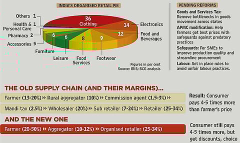 Expectations are that, over the next five years, around $3-4 billion FDI may flow in and help improve the backend logistics, sorting, trading, processing activities—important for improving retail margins while giving a fillip to both farm and industrial activities. The real impact is expected on food and grocery prices. It will also hurt the layers of middlemen—traders, farm aggregators, wholesalers, distributors and the like. These are the segments that stand to be bypassed by organised retail. While they will survive due to demand from the unorganised sector, their margins will surely be hit in the long term.