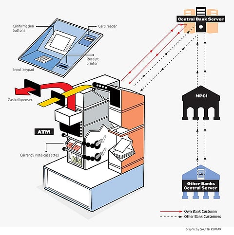 The Process Each ATM is connected to a host computer, which is fitted inside the machine itself. This computer is connected to the central bank server also known as the ATM Switch, which resides at the bank level. The central server is the main brain behind the ATM and gives it instructions to perform various functions, including dispensation of cash. All the screen instructions in an ATM are sent from the central server.