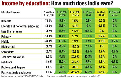 A substantial increase in capacity of vocational training, ways to enter and exit from the formal education system, and simple tools, such as allowing vocational training credits to be transferred as an “opening balance” to the formal education system, would work. But ensuring that labour gets trained in an employable, not defunct trade is also key. Besides unemployment, the “skill gap” has an unhealthy impact on livelihoods and the ability of Indians to climb out of poverty. The report finds that incomes naturally tend to rise with the higher number of years of education completed.